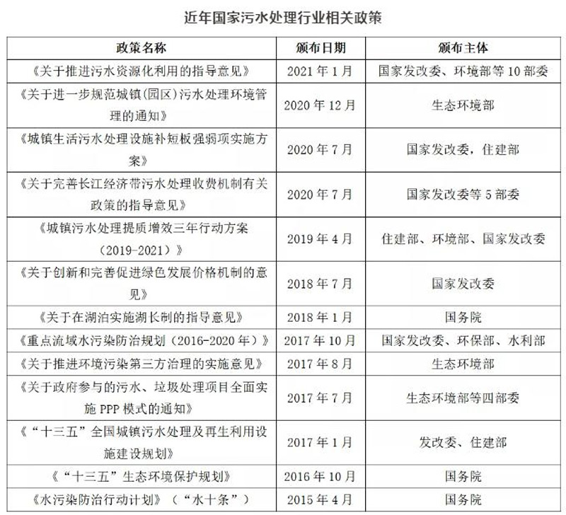 隨著我國經濟不斷發展,生態問題日漸凸顯,政府對環保問題日趨重視,近年來,國家出臺多項污水處理相關政策,涉及水污染防治、污水處理市場化機制等多方面內容,推動我國污水處理市場不斷規范化發展。