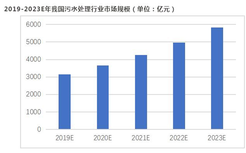 受國家政策支持、各方資本涌入、技術工藝革新等因素驅動,我國污水處理行業將持續快速發展,預計到2023年,我國污水處理行業市場規模將達到5820億元,2019-2023年復合增長率達14.7%。